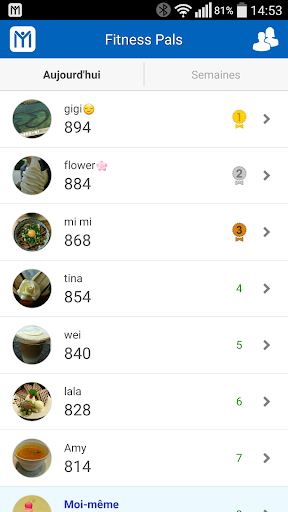 • Fitness Pals : invite vos amis à vous rejoindre quand vous faites de l'exercice, partager mutuellement des mots d'encouragement dans un chat en temps réel et affiche le classement quotidien/hebdomadaire de compétitions sportives en ligne
