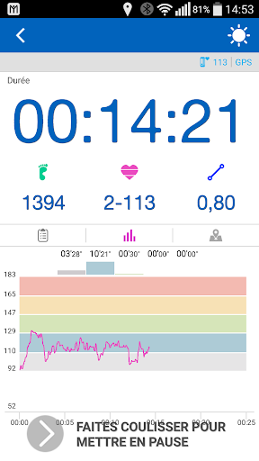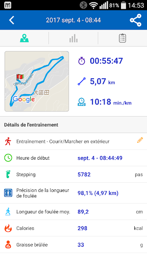 o Consultez des statistiques/graphiques détaillés de votre rythme, distance, heure, vitesse, altitude et calories brûlées