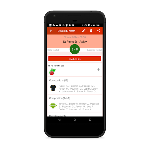 - Ajoutez les matchs de votre équipe, les convocation, la composition et vos notes personnelles, les résultats, les buteurs, les minutes jouées, les tactiques. Partagez-les avec vos joueurs via la page Facebook de l'équipe, SMS, WhatsApp ou email