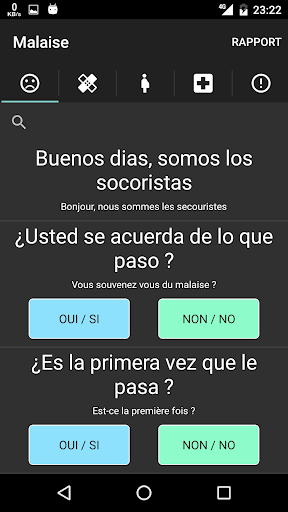 Les questions sont classées par thème : malaise/ trauma/ grossesse/médecin/informations.
