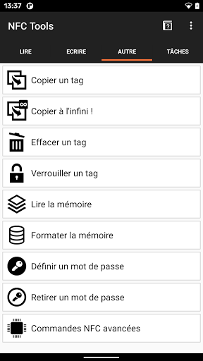D'autres fonctionnalités sont disponibles dans l'onglet "Autre", telles que la copie, l'effacement ou la protection par mot de passe d'un tag NFC.