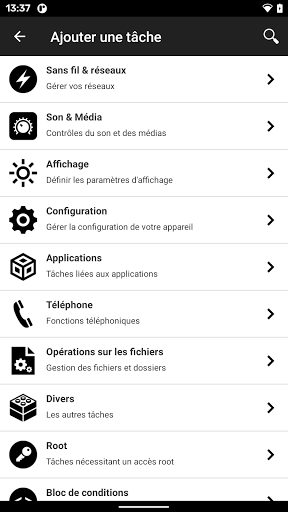Les tâches permettant d'automatiser votre téléphone sont disponibles dans l'onglet "Tâches" et sont classées par catégorie.