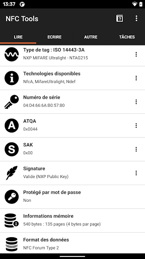 Passer votre appareil à proximité d'une puce NFC sur l'onglet "Lire" vous permet de voir des données telles que :