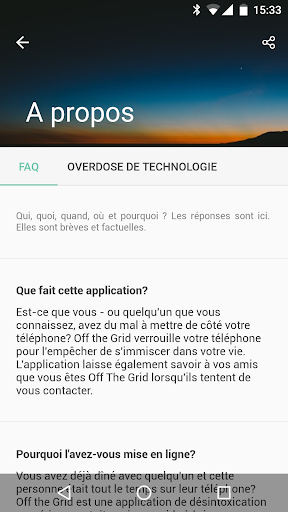 Nous dépensons en général 31% de notre temps sur nos appareils mobiles. Oui vraiment! Off the Grid est une application de désintoxication numérique qui vous aide à freiner cette dépendance afin de réduire cette statistique et reconnecter avec la vie réelle. En plus, c'est gratuit!
