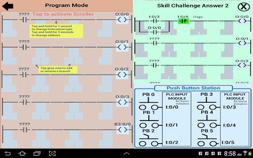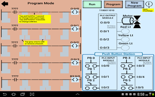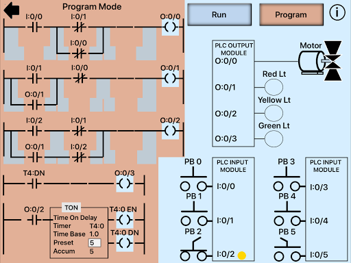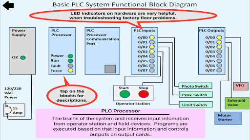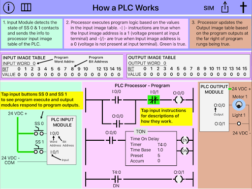 Cette application est conçue pour aider quiconque qui est nouveau aux automates et souhaite apprendre les bases de "Comment un PLC fonctionne" et de jouer avec un simulateur simple pour expérimenter une programmation simple. L'application consiste en trois sections principales, "comment un automate fonctionne", "diagramme de bloc d'automate" et le simulateur d'automate. Le simulateur d'automate permet au débutant d'apprendre de simples compétences de programmation avec 3 minuteries, 2 comptoirs, 6 comparer des instructions, 2 sorties binaires et 3 sorties RES. L'interface utilisateur est très sympathique. Pour les utilisateurs de première fois, il existe une icône d'informations qui montre à quel point cette application est facile à programmer.