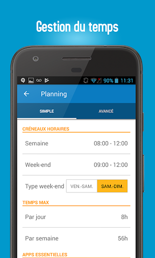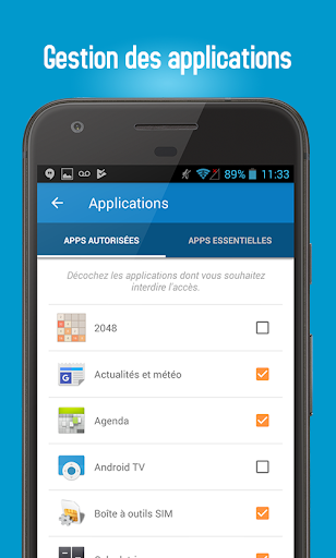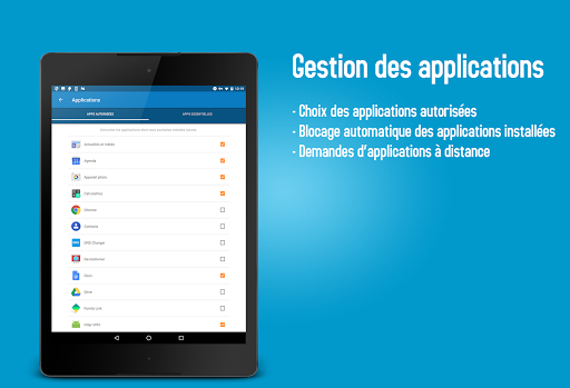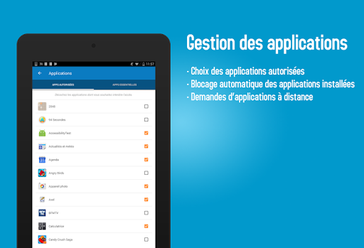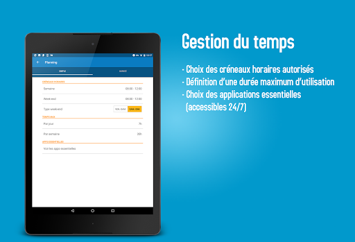 Contrôle parental pour Android incluant la navigation web sécurisé, la gestion des applications et du temps d'utilisation.