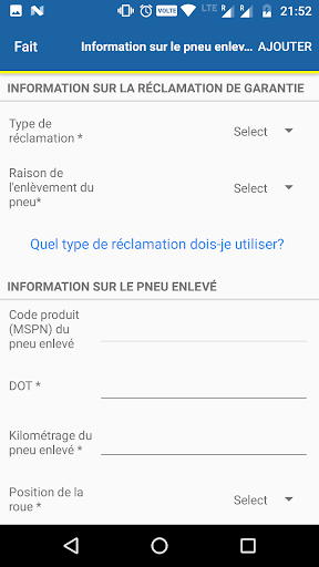 • Saisie des données de réclamation de garantie sur les modèles compatibles de téléphones ou de tablettes Android, que l’appareil soit en ligne ou hors ligne. (NOTE : Les données peuvent être saisies hors ligne, mais leur soumission à Michelin exige une connexion Wi-Fi ou de données cellulaires.)
