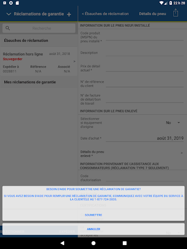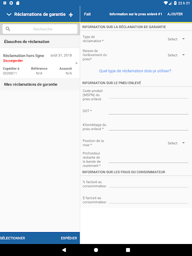 • Inspection numérique en temps réel lors de la soumission d’une réclamation de type 7 (geste de bonne volonté du service d’assistance aux consommateurs). Vous serez informé dans l’application si les pneus doivent être mis au rebut plutôt que retournés au centre d’inspection. La réclamation passera alors à l’état Soumise, et un crédit sera accordé dans les 48 heures.
