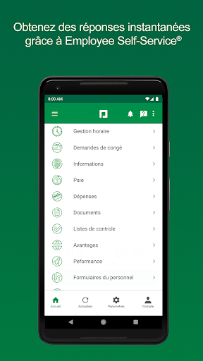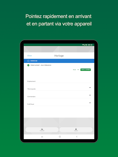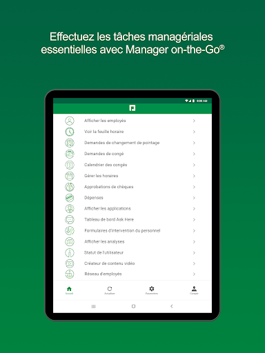 Étant donné que le travail ne s’arrête pas lorsque les responsables sont absents du bureau, la fonction Manager on-the-Go les aide à tirer le meilleur parti de leur journée de travail. Cet outil mobile permet aux responsables et aux superviseurs d’effectuer des tâches de gestion essentielles impliquant leurs employés où qu’ils se trouvent, comme par exemple avaliser le nombre d’heures travaillées, accepter des demandes de congé et des notes de frais, afficher les horaires des membres de leur équipe, etc.