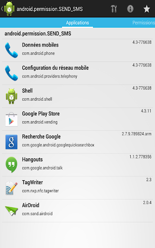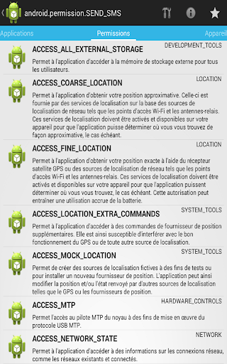 Ex: identifier les applications qui détiennent les droits d'envoi/réception SMS/MMS...