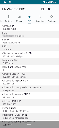 - Infos Wifi: IP, DNS, DHCP, MAC, SSID, etc.