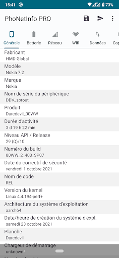 - Infos Appareil en générales: Fabricant, modèle, micrologiciel, date de fabrication, CSC, pays de fabrication, résolution d'écran, dernier redémarrage, etc.