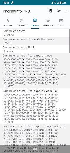 - Infos Caméra: Résolutions supportées, zoom, flash, focus, etc.
