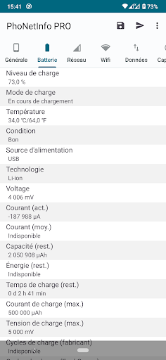 - Infos Batterie: Status de batterie, état de batterie, température, voltage, capacité, etc.