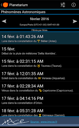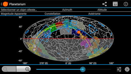 Sélectionnez la position de l'observateur, la date, l'heure et le fuseau horaire et affichez les différentes informations et vues disponibles.