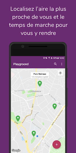 Playgroond vous fait découvrir les aires de jeux pour enfants autour de vous. L’application vous localise sur une carte puis fait apparaître les aires de jeux qui vous entourent ainsi que le temps de marche pour vous y rendre. Une fiche détaillée sur chaque aire de jeux vous permet d’en savoir un peu plus : tranche d’âge, horaires d’ouverture, équipements, note, photos, etc.