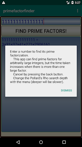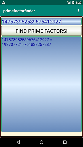 Les progrès sont présentés par des facteurs de liste telles qu'elles sont trouvées. Si un sous-facteur connu pour être non-prime prend beaucoup de temps pour la factorisation, l'affichage montrera "travailler ...". Le calcul peut être annulé en appuyant sur le bouton arrière de l'appareil. Toutefois, si l'application ne trouve pas tous les facteurs, il terminera et énumérera tous les facteurs qu'il a trouvés.