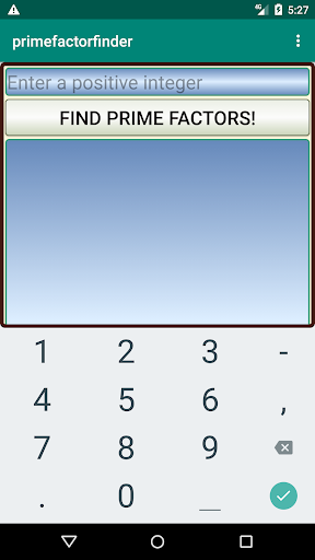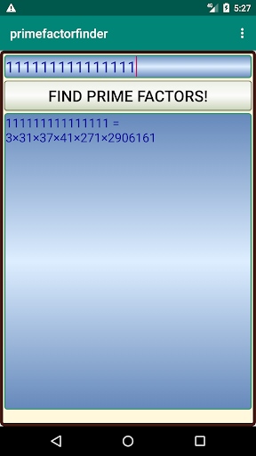 Les entiers avec des facteurs primaires de sept chiffres ou plus prendront plus de temps à la factorisation, en fonction de l'appareil. L'application est en cours d'exécution.