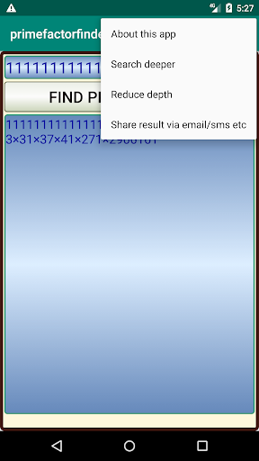Un bouton de menu permet de calculer les calculs de la factorisation. étendu pour les appareils plus rapides. Les calculs RHO de Pollard sont itérés plus de fois lorsque la profondeur d'augmentation, ce qui entraîne la factorisation des nombres «plus difficiles», mais prend plus de temps. La profondeur peut également être réduite.