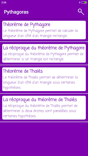 Pythagoras est une application éducative permettant de découvrir les maths. Régulièrement mise à jour, n'hésitez pas à laisser des commentaires afin d'en améliorer votre utilisation. Actuellement, vous pourrez trouver les théorèmes suivants :