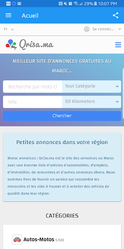 Qri3a.ma est le site des petites annonces gratuites dans tout le Maroc. Notre objectif est de créer une plate-forme où tous les utilisateurs peuvent trêver et faire de la publicité gratuitement. nous listons différents types de produits et nous nous assurons qu'ils sont à jour, nous listons les voitures, les offres d'emploi, les biens immobiliers et les services. l'application fonctionne comme la plupart des applications au Maroc comme avito.ma marocannonces.com, et mabroka.ma