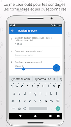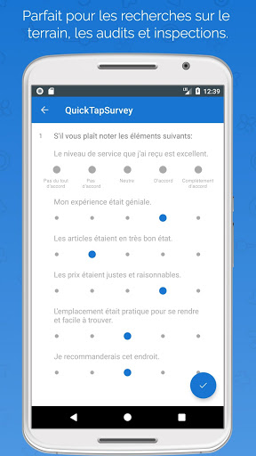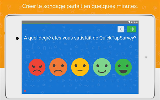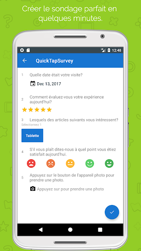 QuickTapSurvey est une plateforme de sondage et de collect de données mobile qui permet aux utilisateurs de créer leurs propres sondages et de réunir des réponses à l'aide des tablettes sans connection internet. Elle est l'application de sondage la mieux notée, utilisé par des milliers d'organismes dans plus de 50 pays à travers le monde. Essayez la dès maintenant GRATUITEMENT!