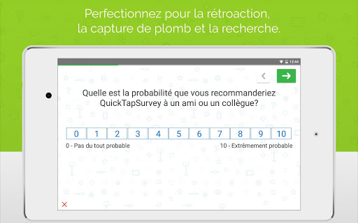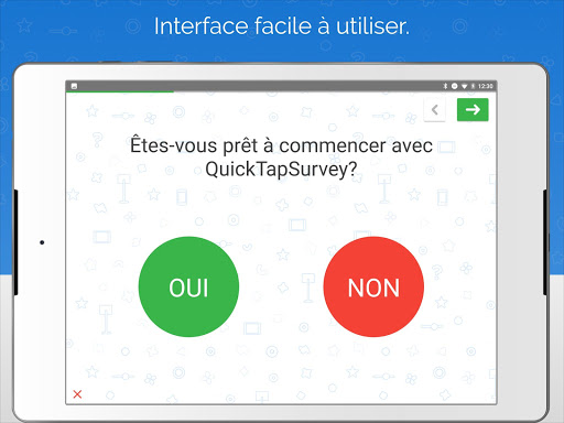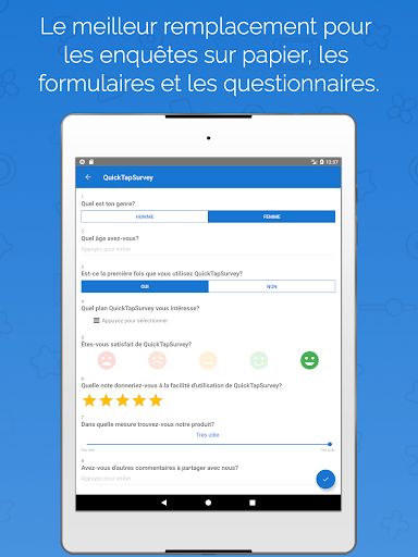 QuickTapSurvey est vraiment très simple d'utilisation, personnalisable et peut facilement transformer votre tablette en Kiosque. C'est l'outil parfait pour les enquêtes sur le terrain, les retours clients, les salons et évènements de prospection de contacts, audits, inspections, évaluations et tout type de collection de données.