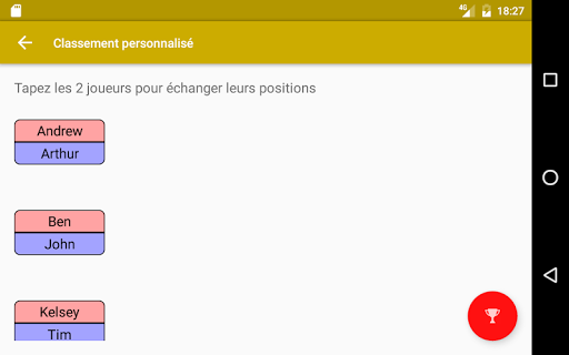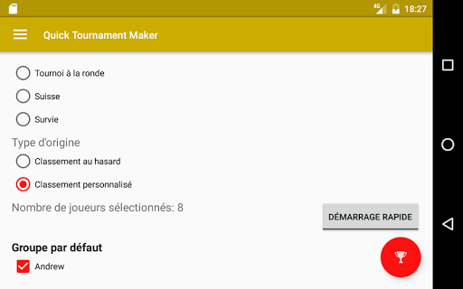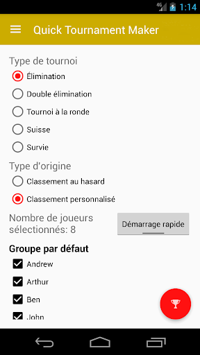Avez-vous déjà eu envie de mettre en place un tournoi avec vos amis, mais ne pouvez jamais décider comment programmer les matches? Quick Tournament Maker s'efforce à éliminer les tracas de devoir décider en créant le calendrier pour vous. Pour plus de détails, cliquez sur l'en-tête ci-dessous.