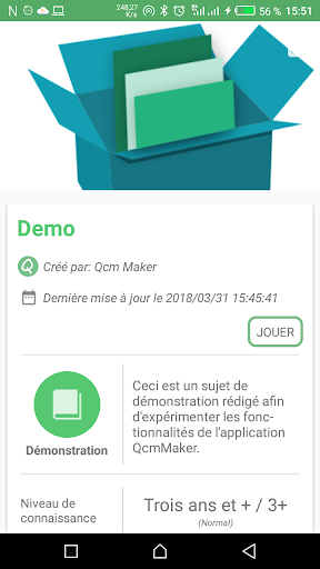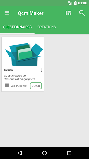 L'application vient avec un seul fichier questionnaire embarqué "demo.qcm" qui vous permettra de découvrir et d'expérimenter les possibilités offerte par l'application. En suite vous devrez créer les vôtres ou recevoir de nouveaux fichiers de questionnaire (*.qcm) provenant de vos contacts pour les jouer ou les rééditer.