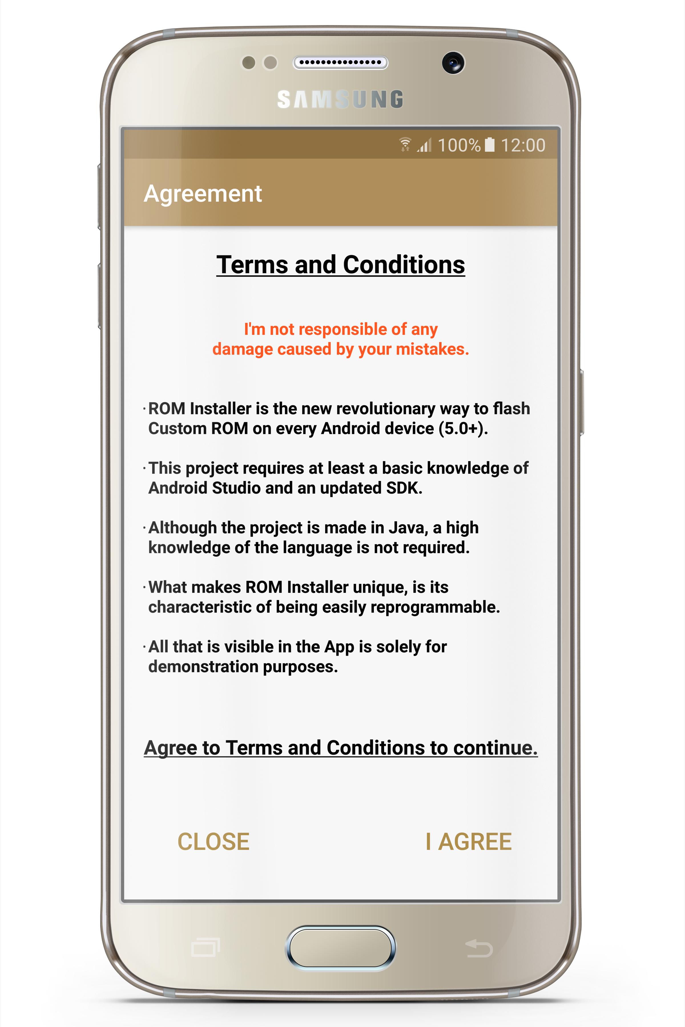 ROM Installer is a source code project. This means that you have to download the project from GitHub and to import it into your Android Studio. This project requires at least a basic knowledge of Android Studio. Although the project is made in Java, a high knowledge of the language is not required. ROM Installer is the new revolutionary way to flash Custom ROM on every Android device (Android 5.0 or higher). What makes ROM Installer unique is its characteristic of being easily reprogrammable by the developer who adopts it. The App has two user interfaces (ButtonUI and SwipeUI), offers the possibility to add a splash and a disclaimer screen, to verify the integrity of the ROM before installing, to download any type of file in many different modes, to download and install a recovery. This project is distributed under GNU General Public License. This means that you must respect the freedom of Open Source. I'm giving you this revolutionary project for free and I expect that you keep this public and Open Source. Moreover you must upload your custom version of this project on GitHub because your work could act as an example for other developers interested in this project and also because I can help you in case you need my help. The most important benefit for users is that they can choose what features to install on their devices. Instead, the most important benefit for developers is that they don't have to edit their updater-script in order to remove mods or features due to users requests. The developer has just to configure the App with a preference for each feature he wants to include in his ROM. Then is on the own of each user to choose whether to install that feature or not.
