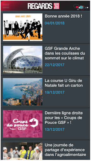 Regards 360 est une application mobile à l'usage exclusif des salariés du groupe GSF. Enrichie régulièrement de nouveaux contenus, elle permet de suivre en direct et de n'importe où l'actualité du groupe GSF et de ses filiales.