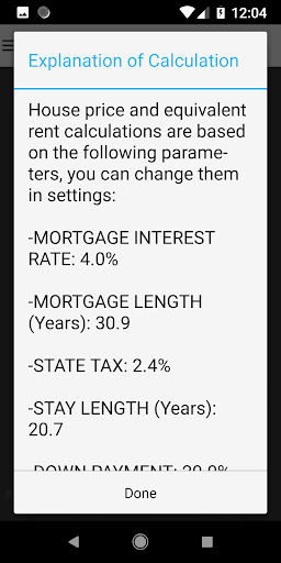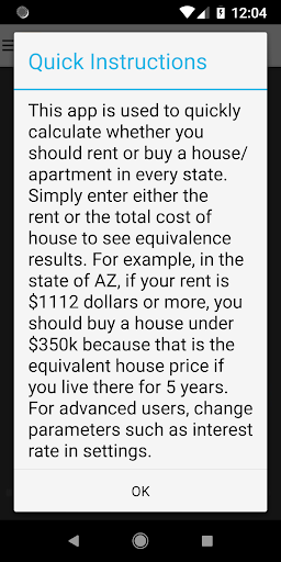 Cette application est utilisée pour calculer rapidement si vous devriez louer ou acheter une maison / appartement dans chaque état.Entrez simplement le loyer ou le coût total de la maison pour voir les résultats d'équivalence.