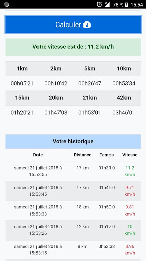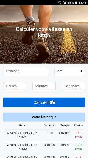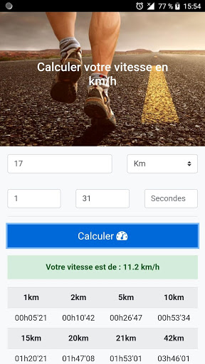 Grace à cette application vous pouvez calculer votre vitesse de course en km / h pour une distance de saisie.