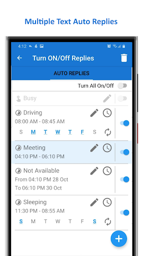 ✔ Configuration des réponses automobiles multiples pour les SMS entrants - 1 Réponse SMS pour la conduite, 1 pour dormir, 1 pour rencontreretc - Faites en sorte que votre appareil exécute automatiquement les tâches de réponse automatique