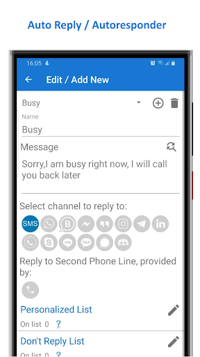 Application SMS Auto Reply (publié 2016) - Automation App qui vous aide à répondre automatiquement avec des messages texte / SMS à des SMS / SMS entrants lorsque vous êtes occupé, loin, lors d'une réunion, en vacances, en congé, hors du pouvoir.De plus, pendant que vous conduisez, dormez ou tout simplement lorsque vous préférez ne pas être dérangé.En plus du message général, vous pouvez répondre avec des messages privés ou bloquer les messages SMS de certains contacts "Liste noire".