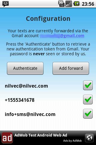 SMSForwarder can automatically forward your incoming and outgoing texts to another phone number or to an email address via gmail It does not need your Gmail password you just allow it to use Gmail as an SMTP server You can add as many email addressesphone numbers to forward to as you like.Now with a new, simplified configuration process.Give it a try