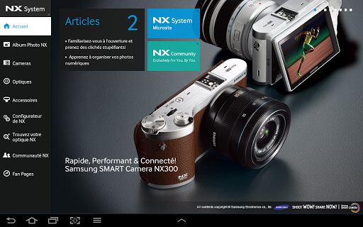«Samsung SMART camera NX» est une application axée sur l'expérience utilisateur. Avec elle, partez à la découvertede l’ensemble des produits de la gamme NX et vivez une expérience unique. Obtenez les dernières information sur l’environnement produit de la gamme Samsung NX, des exemples de photos et vidéos et bien plus encore.Cette application fournit non seulement des informations sur le dernier Samsung SMART CAMERA NX300 et ses fonctionnalités avancées telles que le système de mise au point hybride et sa vitesse d’obturation à 1/6000 de sec. mais égalementtoutes les informations sur les optiques du Système NX.Découvrez les nouvelles fonctionnalités de la gamme Samsung SMART CAMERA NX, comme la connectivité Wi-Fi, et partagez ainsi vos plus beaux moments avec vos amis, votre famille ou sur les réseaux sociaux. Percevez la puissance du nouveau capteurCMOS APS-C de 20.3MP.«Samsung SMART CAMERA NX» est aussi une source d'informations intéressantes et utiles qui vous permet de découvrir le Samsung SMART CAMERA NX comme la fonction«Trouvez votre optique NX» qui recommande l’optique la plus appropriée en fonction du sujet de votre photographie. La fonction «Configurateur de système NX» vous permet de combiner différents appareil photo et objectifs de la série NX dans diverses combinaisons.1) Fonctions principales• album photo NX : Vous pouvez voir différents exemples de photos prises avec les appareils photo Samsung NX et objectifs, voir les publicités télévisées et des échantillons de vidéos.• Information produit :Il fournit les caractéristiques et les designs des appareils Samsung NX, objectifs et accessoires, des informations de compatibilité, photos etbien plus encore.• Combinaison NX :Vous pouvez sélectionner l'appareil NX et l'objectif de votre préférence et les combiner virtuellement et visualiser les exemples de photos prises avec le produit combiné.• Trouvez votre optique NX :Grâce à une simple série de questions, il recommande l’objectif Samsung NX la plus appropriée en fonction du sujet de votre photographie.• Pages Fan :Vous pouvez consulter les medias sociaux des produits Samsung SMART CAMERA, les applications mobiles Samsung et des liens.2) tags samsung, smart, camera, NX, smart camera, samsung smart camera, samsung smart camera NX, lens, optique, 3d, wifi photo, album, wallpaper, NX300, NX2000, NX1100, NX20, NX1000, NX210, NX200, Usain Bolt