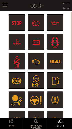 • "Témoins" pour accéder à la bibliothèque des témoins lumineux. Vous obtenez le nom et la signification de tous les témoins lumineux et les premiers conseils à suivre en cas de témoin allumé.