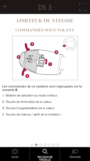Réalisez facilement les différents réglages dans votre DS au travers de schémas illustrés ou animés (sièges, radio, écrans, affichage tête haute, limiteur de vitesse, airbags, caméra de recul, etc.). Elle vous fournit également des informations sur tous les témoins lumineux de votre véhicule DS.