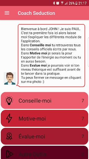 Pour commencer le coaching télécharge maintenant notre manuel du séducteur qui sera ton meilleur guide pour réussir dans le game de la séduction ! Oublie tous les vieux guides du séducteur au format pdf avec notre application tu as un guide gratuit concis et interactif !