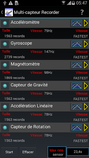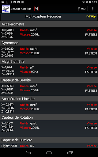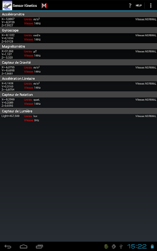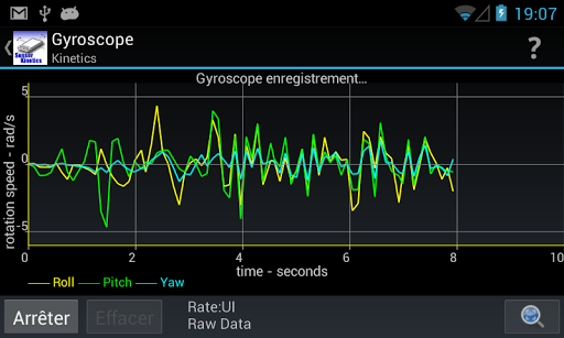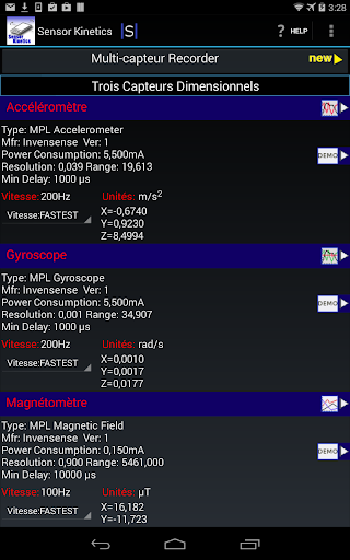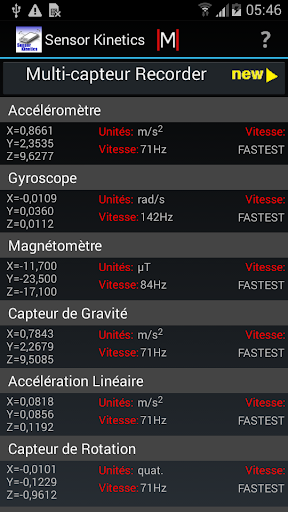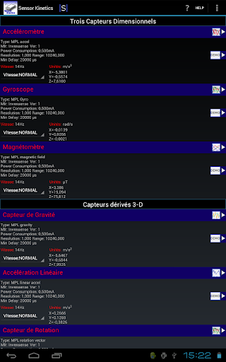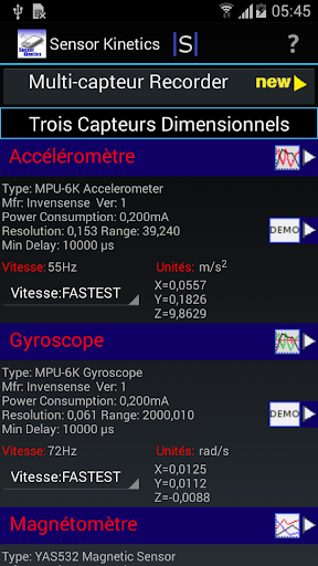 Testez votre téléphone ou tablette Android: Sensor Kinetics vous permet de tester tous les capteurs de votre appareil. téléspectateurs Graphique vous permettent de mesurer n'importe quel capteur au fil du temps et de mesurer leur précision et leur comportement. Vous pouvez modifier différents paramètres de votre appareil fonctionne à sa limite.