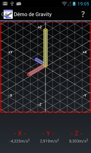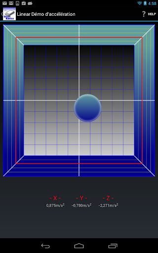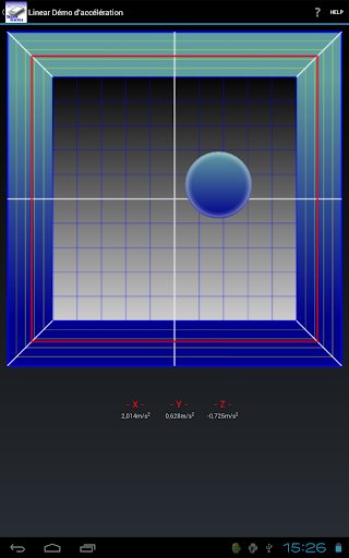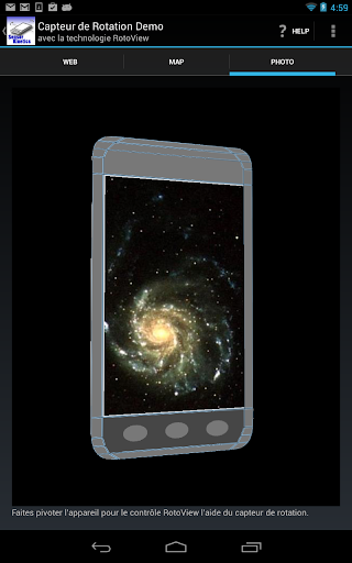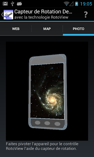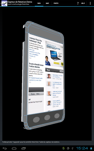 L'application illustre l'utilisation de l'accéléromètre, le gyroscope et le capteur de rotation pour contrôler un écran de navigation inclinaison en fonction comme la technologie RotoView par INNOVENTIONS. Il montre aussi le fonctionnement du capteur magnétique, le capteur d'accélération linéaire et le capteur de gravité dans les affichages graphiques spéciaux.