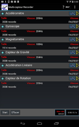 Voir, enregistrer et suivre l'accéléromètre, gyroscope, et tous les autres capteurs dans votre appareil Android.