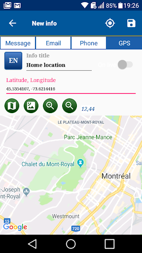 Grâce au développement des nouvelles technologies, l'application donne la possibilité d'échanger votre position GPS en temps réel et de la représenter directement sur une carte. Pour utiliser cette options, vous devez autoriser à l'application l'accès à votre position.