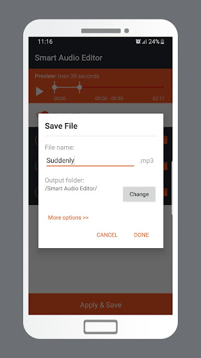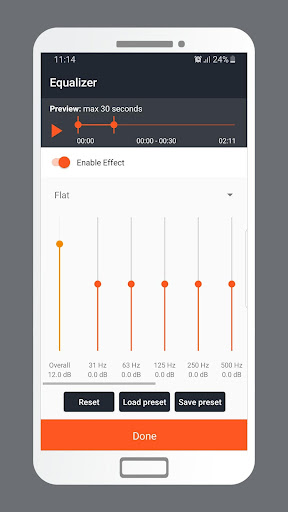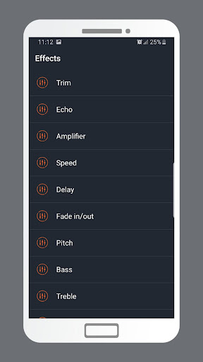 Cette application est livrée avec de nombreux effets audio qui peuvent être appliqués à n'importe quel fichier comme Echo,Retard, vitesse, fondu dans / s'estomper, basse, tangage, triplé, chœur, inducteur, effet sonore de la caisse d'oreille ou vous pouvez notre outil d'égaliseur avancé.