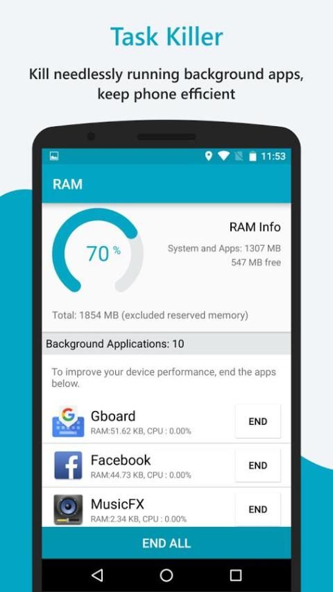 Cleans Ram with unwanted files and data.