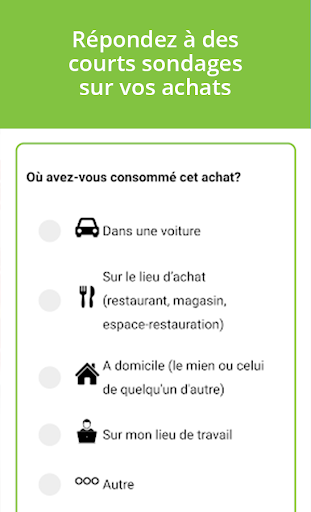 1) Dans l’application SnapMyEats, utilisez le questionnaire et répondez à cinq questions sur vos achats alimentaires et de boissons.
