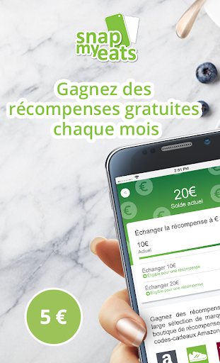 Suivez facilement le statut de vos récompenses en direct depuis l'application SnapMyEats. Dès que vous atteignez un crédit récompense de €10, échanger votre solde instantanément contre un code-cadeau dans l'appli. Choisissez votre récompense parmi une large sélection de détaillants !