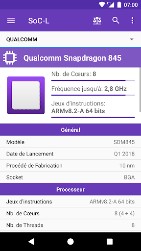Avec cette application, vous pourrez consulter les spécifications des SoC des principaux fabricants: Allwinner, Amlogic, Apple, Broadcom, Cavium, Freescale, HiSilicon, Intel, Leadcore, MediaTek, Nvidia, Qualcomm, Rockchip, Samsung, Spreadtrum, ST-Ericsson, Texas Instruments et Xiaomi .