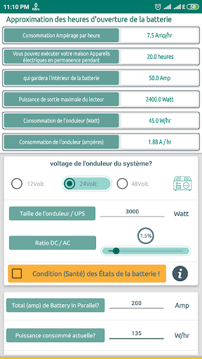 - Simulation pour votre consommation d'énergie et combien de temps les batteries peuvent fonctionner vos appareils et combien restant dans les batteries.